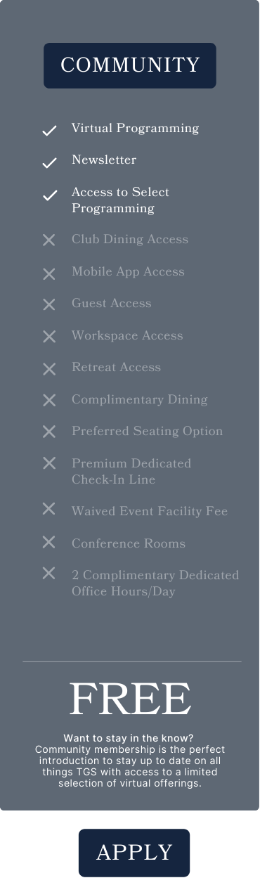 Want to stay in the know? Community membership is the perfect introduction to stay up to date on all things TGS with access to a limited selection of virtual offerings.