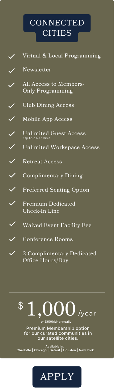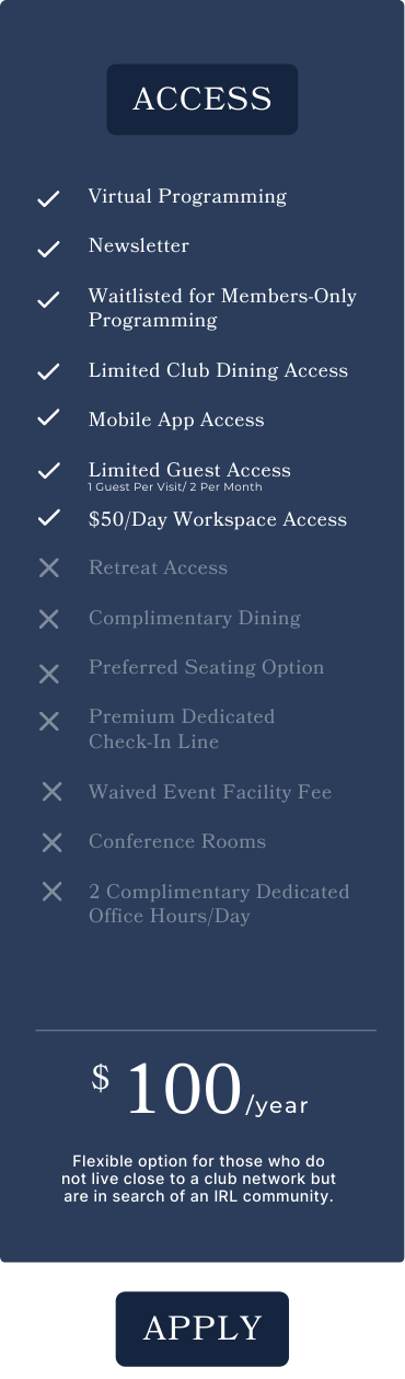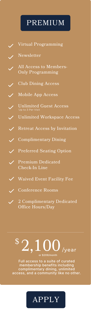 Full access to a suite of curated membership benefits, including complimentary dining, unlimited access, and a community like no other.